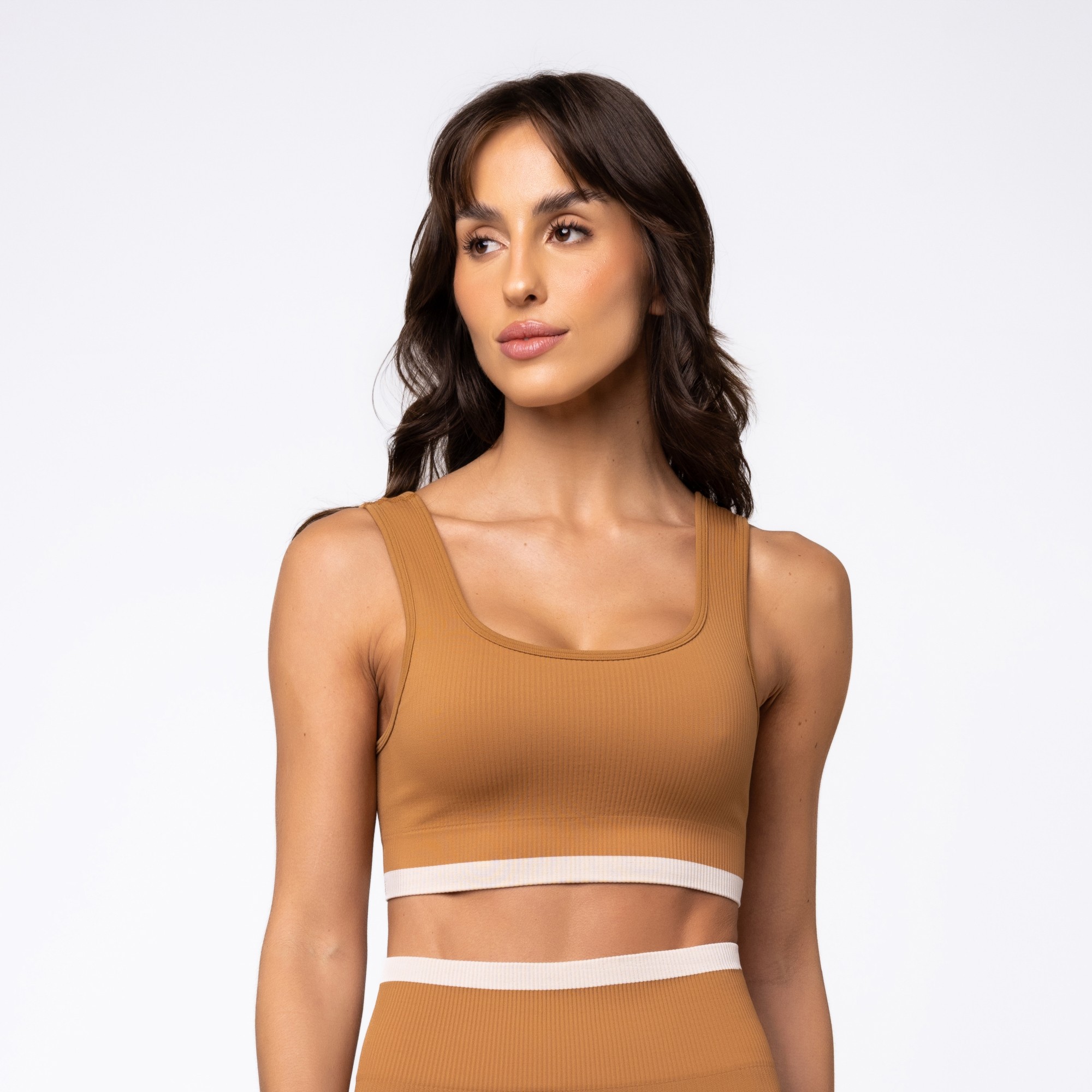 Top com tecnologia seamless e textura canelada que proporciona conforto e sustentação. As alças largas garantem firmeza durante os movimentos, enquanto o decote reto e os detalhes em cinza claro trazem um toque moderno e sofisticado.