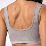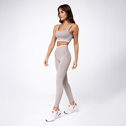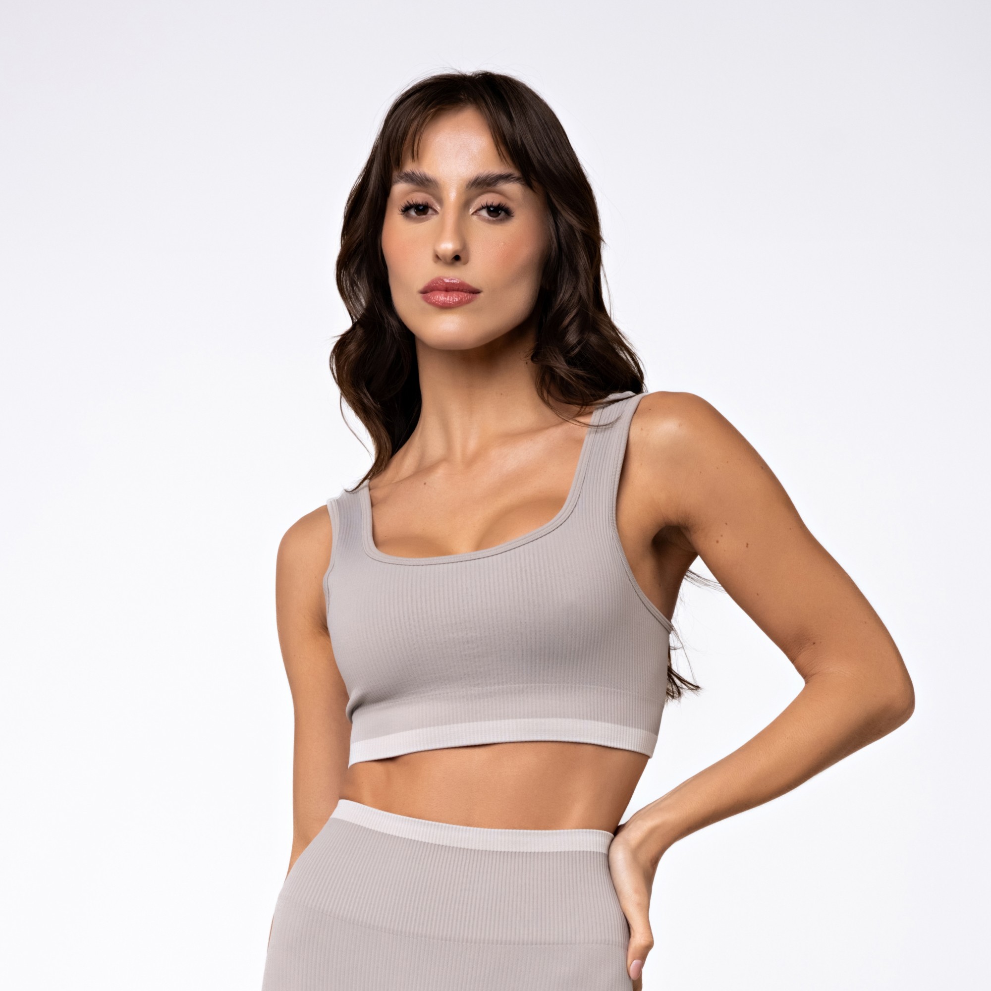 Top com tecnologia seamless e textura canelada que proporciona conforto e sustentação. As alças largas garantem firmeza durante os movimentos, enquanto o decote reto e os detalhes em cinza claro trazem um toque moderno e sofisticado.